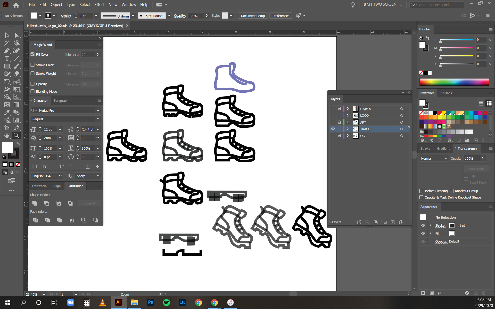 Once we discussed a direction for the project, I got to work thumbnailing a ton of quick ideas in pencil and sent Hike Austin a few of the best once I cleaned them up and vectorized them. The idea we focused on was a bold typeface with elements of nature and some fun colors. This grew again into mixing these elements with a hiking boot per client's request, as it is used often throughout their postings. I used some of my favorite brands of trailrunning shoes and hiking boots for some inspiration, making the boot from scratch in Illustrator. The static boot wasn't quite satisfying until I added the bend to give it the feel of being in motion. I pulled colors from my own experiences hiking and trailrunning in Austin where we experience a ton of warmth year-round while we are in these green spaces with water throughout the area. After some revisions on the placement of the boot and explored a few more color options, we finalized the primary logo with the original colors and I built the submarks from here. During the thumbnail stage, I was designing with this idea of separation in mind as I wanted to give Hike Austin a dynamic logo that can be split into different parts for versatility. This keeps initial costs down and range-of-use high.