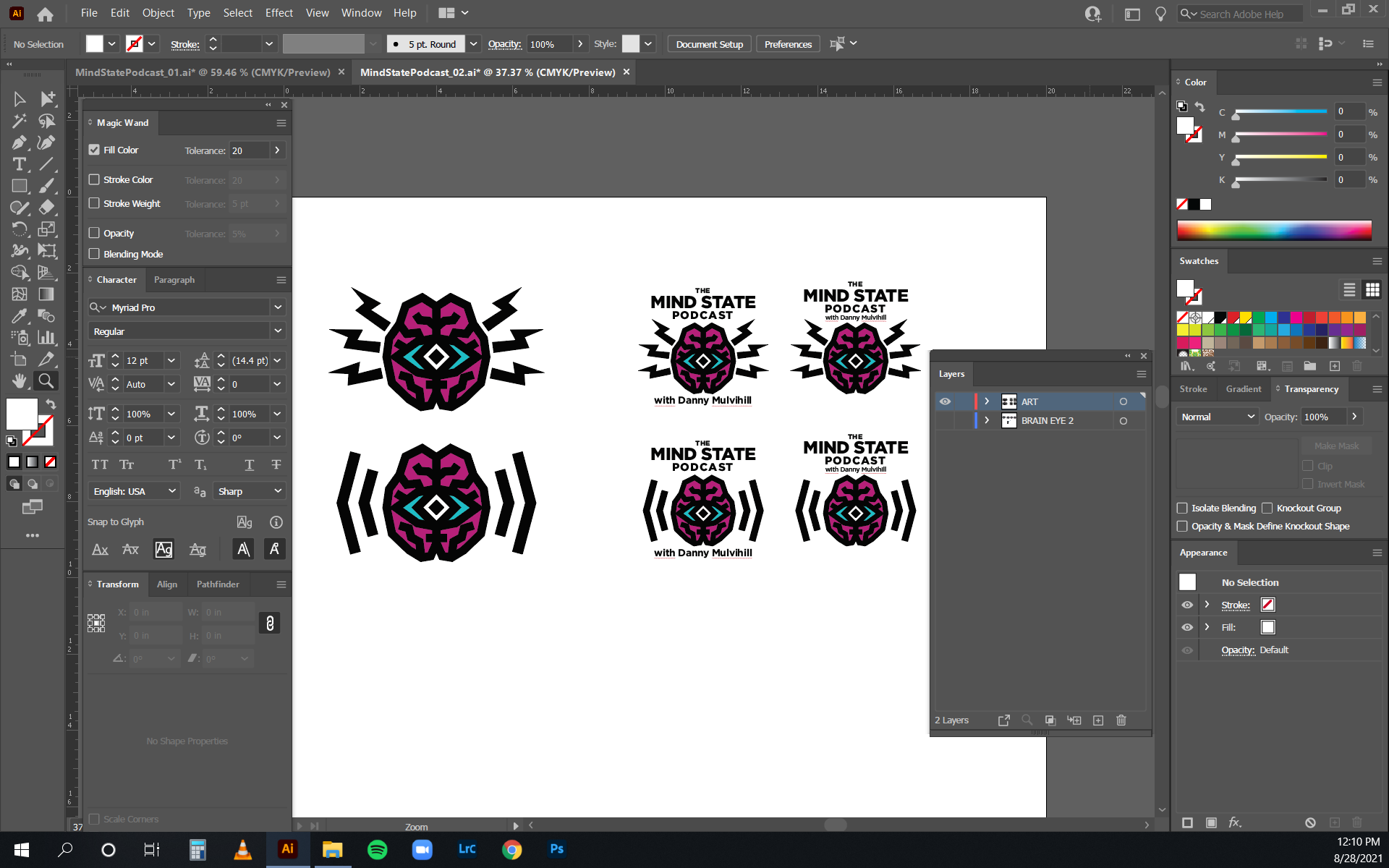 The original concept for the logo was fairly broad and open-ended leaving me plenty of room to dive into the logo from various angles. The primary guidance from Danny was to include an illustration of a brain, minimal type (as he plans to use the logo beyond the show), and the rest was essentially up to me. While this approach provides a great sense of freedom for any creator, it can also present the challenges of which direction to take a vague idea that will still meet a client's needs and vision without excessively returning to the drawing board. Thankfully, Danny is super easy-going and trusted me to create what he needed in a timely fashion. After pitching a few different ideas of brain and third eye concepts, we focused on the idea that incorporated both. My intention behind including a third eye was to help distinguish his logo from other brain icons that tend to look similar (no matter who approaches the design) while also driving home the elevated ideas of unlocking human potential that Danny is looking to cover throughout the course of his show. We improved upon the first draft by sharpening the line work per his request, and then chose colors based on a color scheme Danny had seen in some the apparel he owns.